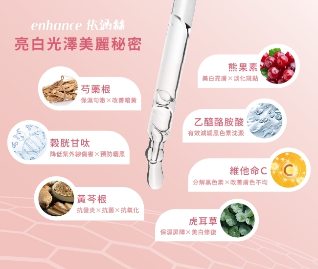 添加芍藥根、黃芩根、虎耳草、乙醯酪胺酸、熊果素、榖胱甘呔、維他命C 等多種活性成分,改善暗沉促進新陳代謝維持嫩白細緻感由內而外打造透亮光澤肌膚!